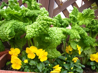 ラティスの前の黄色いビオラと一緒に植えたのは寒咲き菜の花