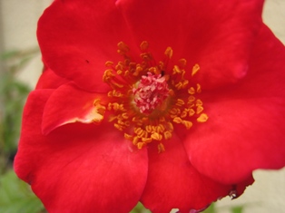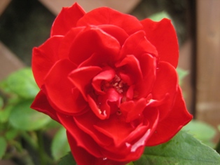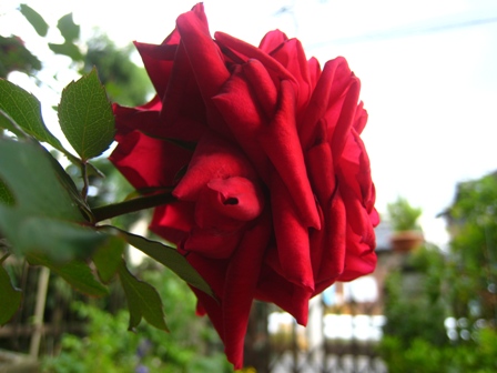 庭では、今日も大輪咲きミニバラ レッドモンテローザ・フォーエバーが咲いています。