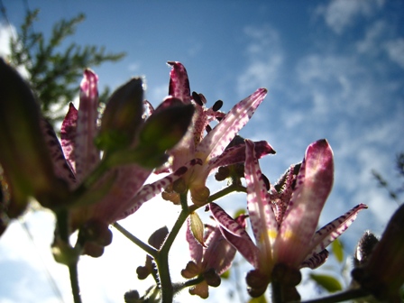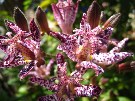今、庭ではホトトギスが咲き始めました。小鳥のホトトギスの胸の斑点に、花びらの紫色の斑点が似ていることから、名前がつけられたそうです。右下は、先日、兵庫県で買ってきたホトトギス 桃源です。