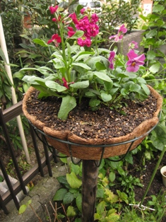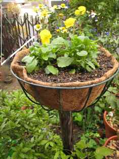 今時期咲かない紫陽花に上に、ポールでハンギングのヤシマットに植えます。