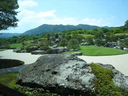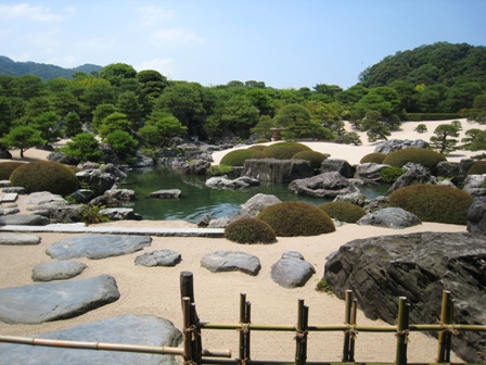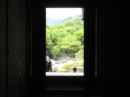 白砂青松庭 中から見ると、生の掛軸 床の間をくりぬいて、山水画の掛軸がかかっているかのようになっていて、美術館の名物です。