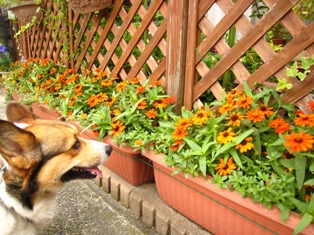 家の前には、ジニア・プロフュージョンとポーチュラカのプランター、この裏に背の高いひまわり…