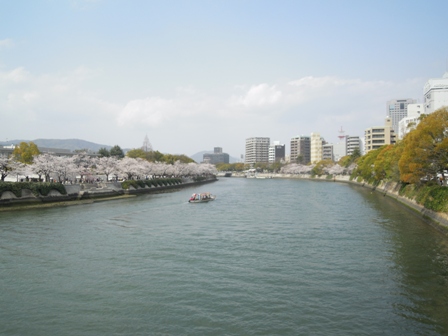 元安川、真ん中向こうに原爆ドーム。 行った目的は、やっぱり桜!