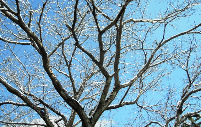 ソメイヨシノの木に雪、白と青い空がとても綺麗でした。