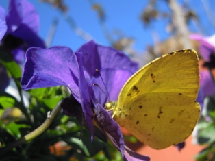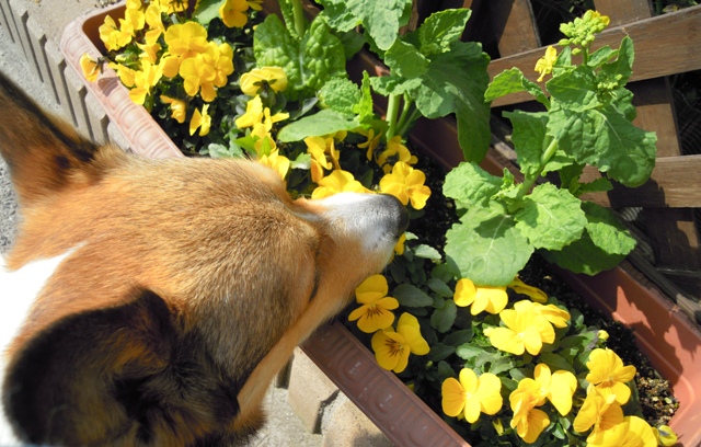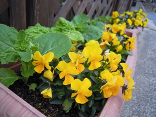 外側の黄色のビオラは、雪や霜で今年はなかなかうまく咲いていないのですが、「いつもキレイですね」とか、「お花の好きな人は悪い人はいない」とか…