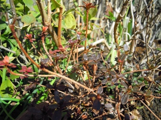 ミニバラは、もう葉が展開し始めました。春の楽しみ、日本さくら草の芽 ↓ が出始めました。