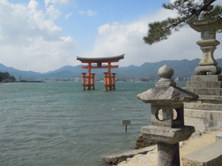 大鳥居、フェリーから(左上、12時半)、宮島から見ると(右上、13時半)