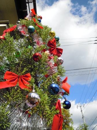 でも、気分だけは味わってみたいもの、我が家の庭の大きくなりすぎた鉢植えのゴールドクレスト、先月終わりに孫①ゆっぴーと飾り付けをしました。