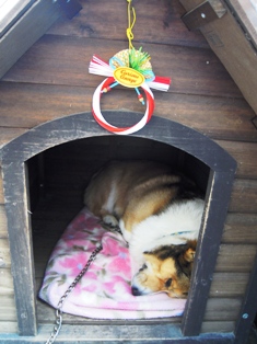 散歩から帰ったら、外の小屋に入りました。今日も寝正月?