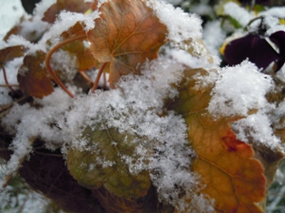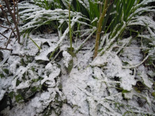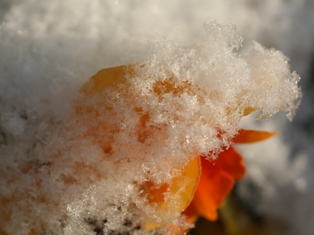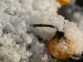 朝はー1℃くらい、今年初めての積雪です。庭のお花も雪をしっかりかぶりました。