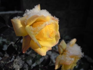 黄色のミニバラにも雪、まだ咲いてる。寒さに強いヒューケラ ↓